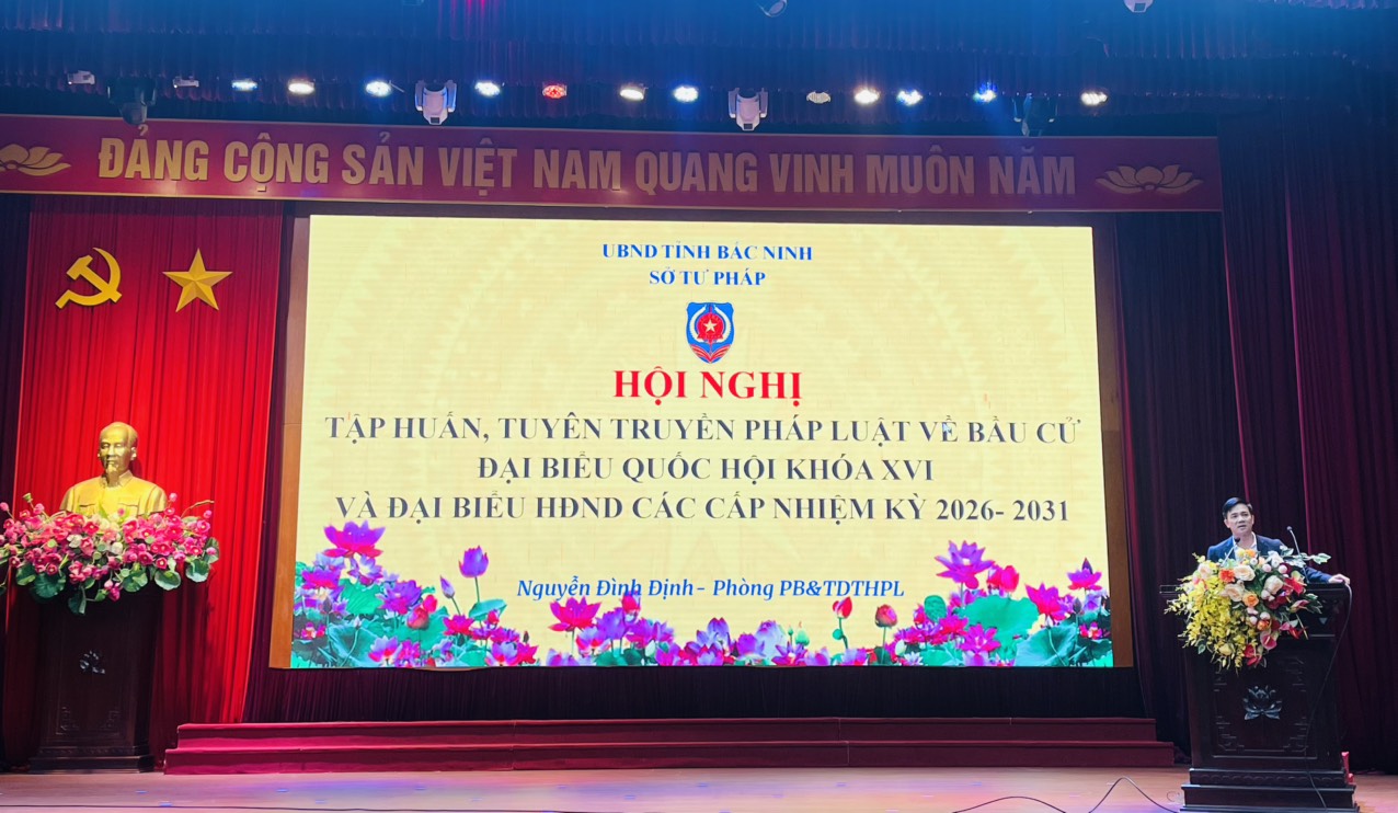 Từ ngày 03/02/2026 đến ngày 05/02/2026, Sở Tư pháp chủ trì phối hợp với UBND: xã Hiệp Hòa, phường Kinh Bắc, phường Bắc Giang và phường Từ Sơn tổ chức Hội nghị tập huấn, tuyên truyền pháp luật về công tác bầu cử đại biểu Quốc hội khóa XVI và đại biểu Hội đồng nhân dân các cấp nhiệm kỳ 2026 - 2031.